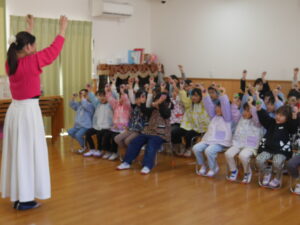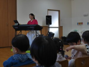 「♪リズムキッチン♪ 音楽の集い」を行いました。野崎さんが来園され、年少・乳児クラス、年長・年中クラスの2部制でエレクトーン演奏をしていただきました。エレクトーンならではの多彩な音を使った音楽がとても素敵で、園児たちは大喜び。歌をうたったり、卵型のマラカスを振ったりと楽しいひと時を過ごしました。