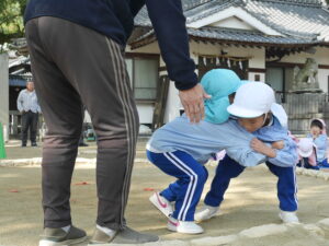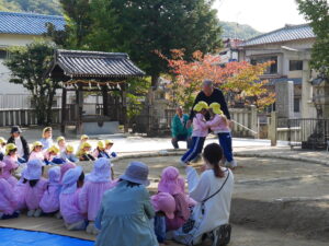 八岩華神社境内において、年長・年中・年少の園児が「相撲大会」を行いました。どのクラスの園児も土俵に上がり真剣な顔でたくましく見えました。