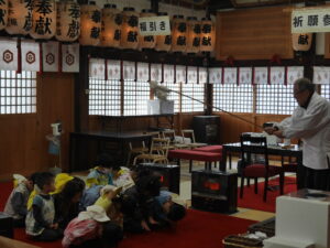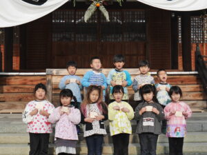年長「ふじ組」年中「さくら組」年少「うめ組」の園児がわかれて 八岩華神社にて「初詣」を行いました。