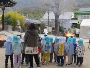 年長「ふじ組」年中「さくら組」年少「うめ組」の園児が八岩華神社にて「とんど祭り」に参加しました。燃やした書初めの紙が高く舞い上がると習字が上手になるなどと言われています。年長の園児は「字が上手に書けますように!」と自分たちが書いた習字を願いを込めて燃やしました。